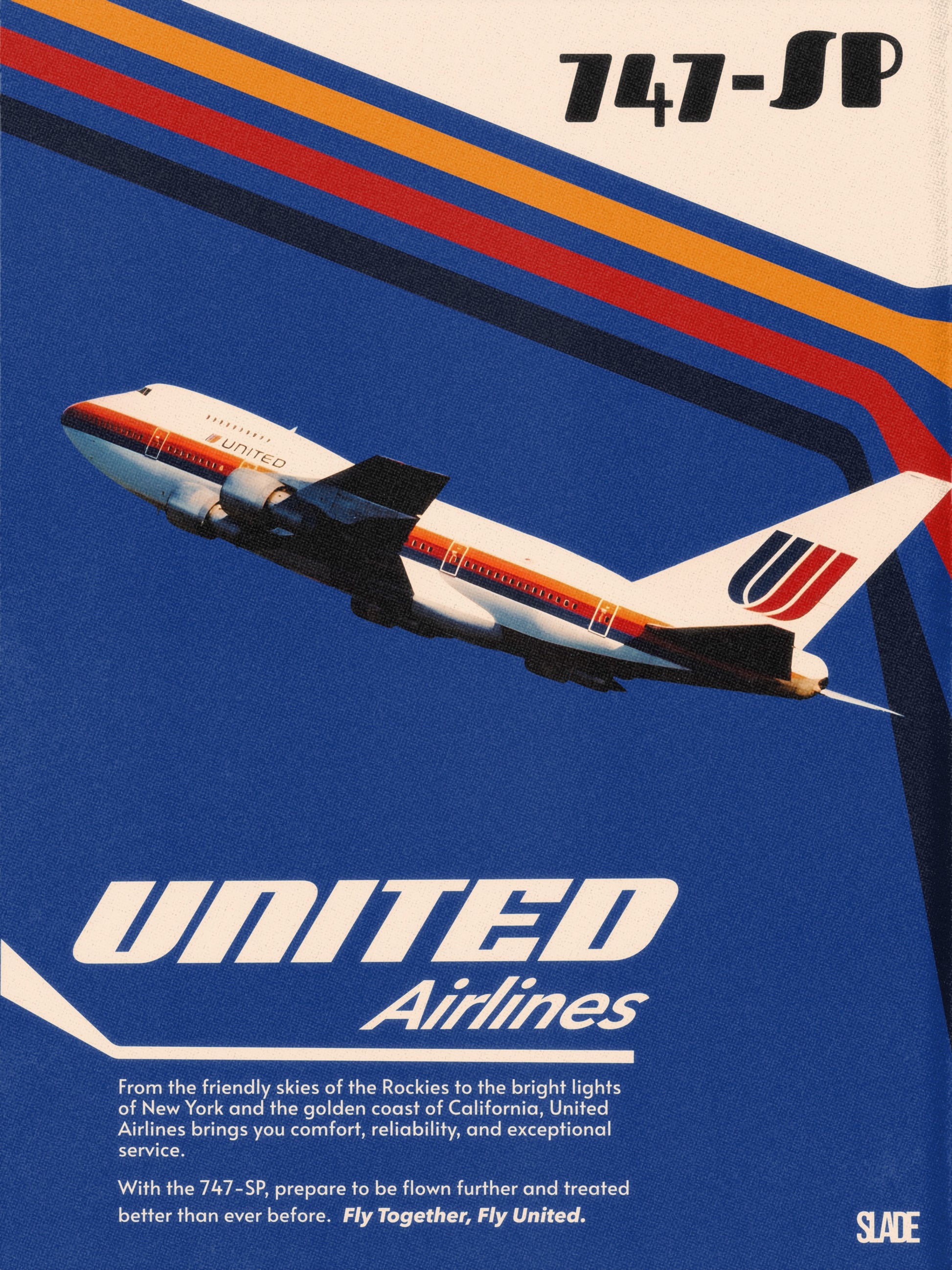 This retro-style poster showcases the United Airlines 747-SP in a vibrant vintage aesthetic.